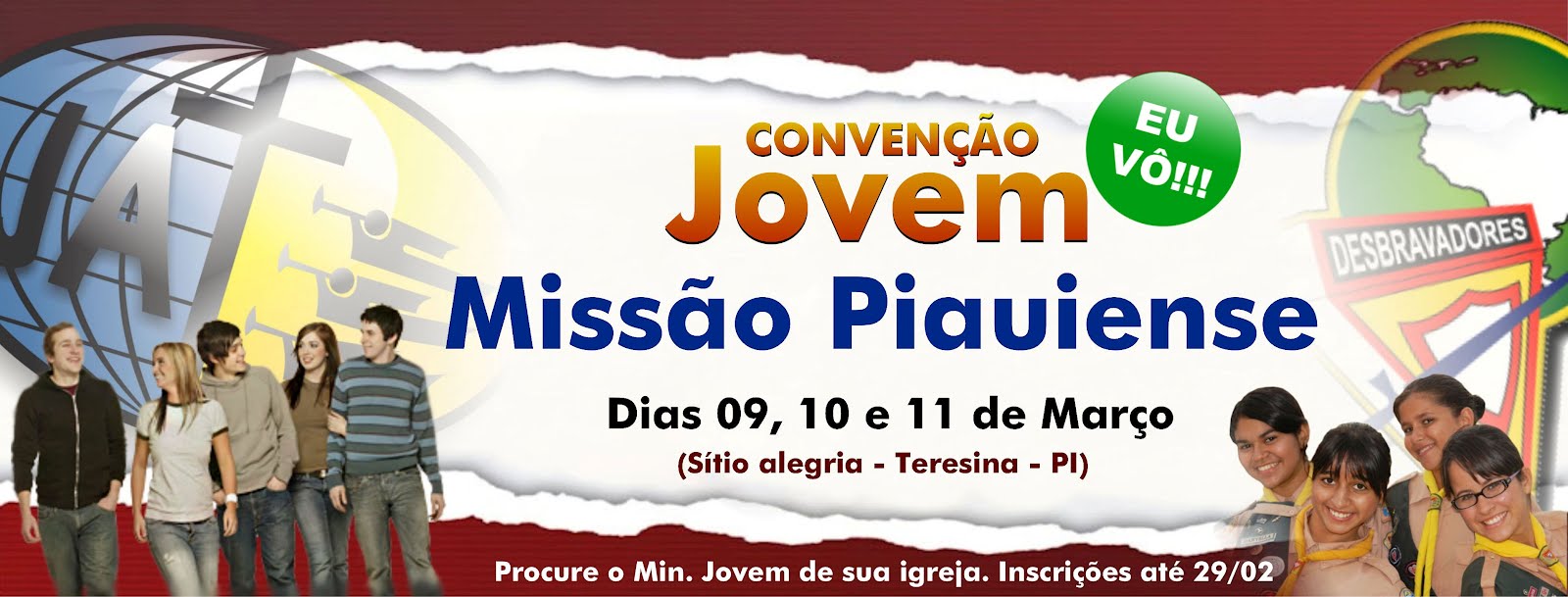 DIAS 9,10,11 DE MARÇO CONVENÇÃO PARA DIRETORES DE JOVENS,DESBRAVADORES E AVENTUREIROS;DETALHE,SOMENTE DIRETORES E ASSOCIADOS.VALOR $35:00. INSCRIÇÕES ATÉ DIA 29 DE FEVEREIRO.(VALOR DA BLUSA $15:00 SERÁ VENDIDA NO LOCAL DA CONVENÇÃO ) O MATERIAL QUE VOCÊ RECEBERÁ ESTÁ PREPARADO E SERÁ PERSONALIZADO. LEMBRANDO A VOCÊ QUE SERÁ INVESTIDO EM LÍDER ESTE ANO, PODERÁ SE INSCREVER TAMBÉM, MAS SOMENTE AQUELES EM ATIVIDADE. MINISTÉRIO JOVEM - MISSÃO PIAUIENSE PR. LEANDRO E COORDENADORES